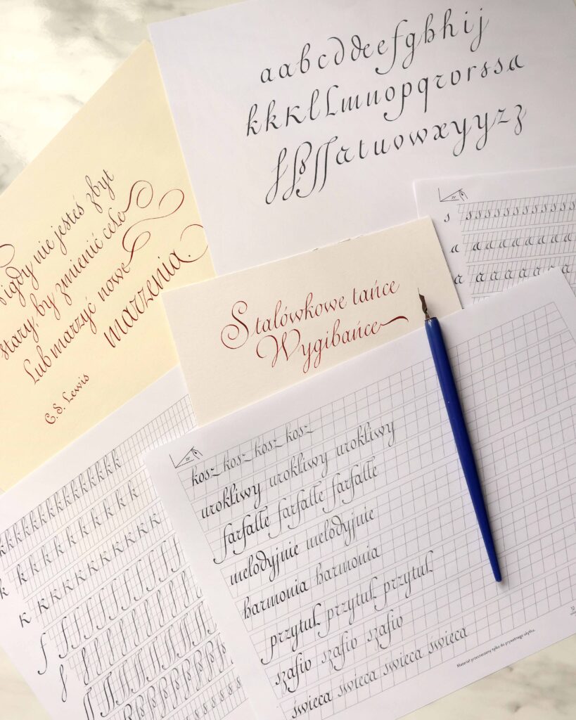 stalówkę, obsadkę, do tego obszerny pakiet autorskich wzorników i ćwiczeń (do dalszej samodzielnej nauki w domu!).