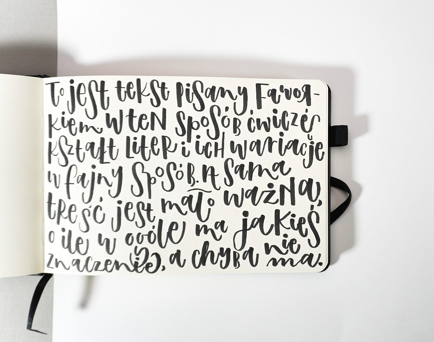 Kaligraficznym motywem przewodnim będzie nam Faworek! To autorski krój pisma, zaprojektowany przez Aleksandrę Ćwikowską dla uczniów Nice Letter Studio. Powstał, by przybliżyć studentom zakres zagadnień kompozycyjnych, ułatwić ich zrozumienie. Faworkiem nie da się pisać bez myśli o kompozycji, która jest wymagana już przy pojedynczej literze.